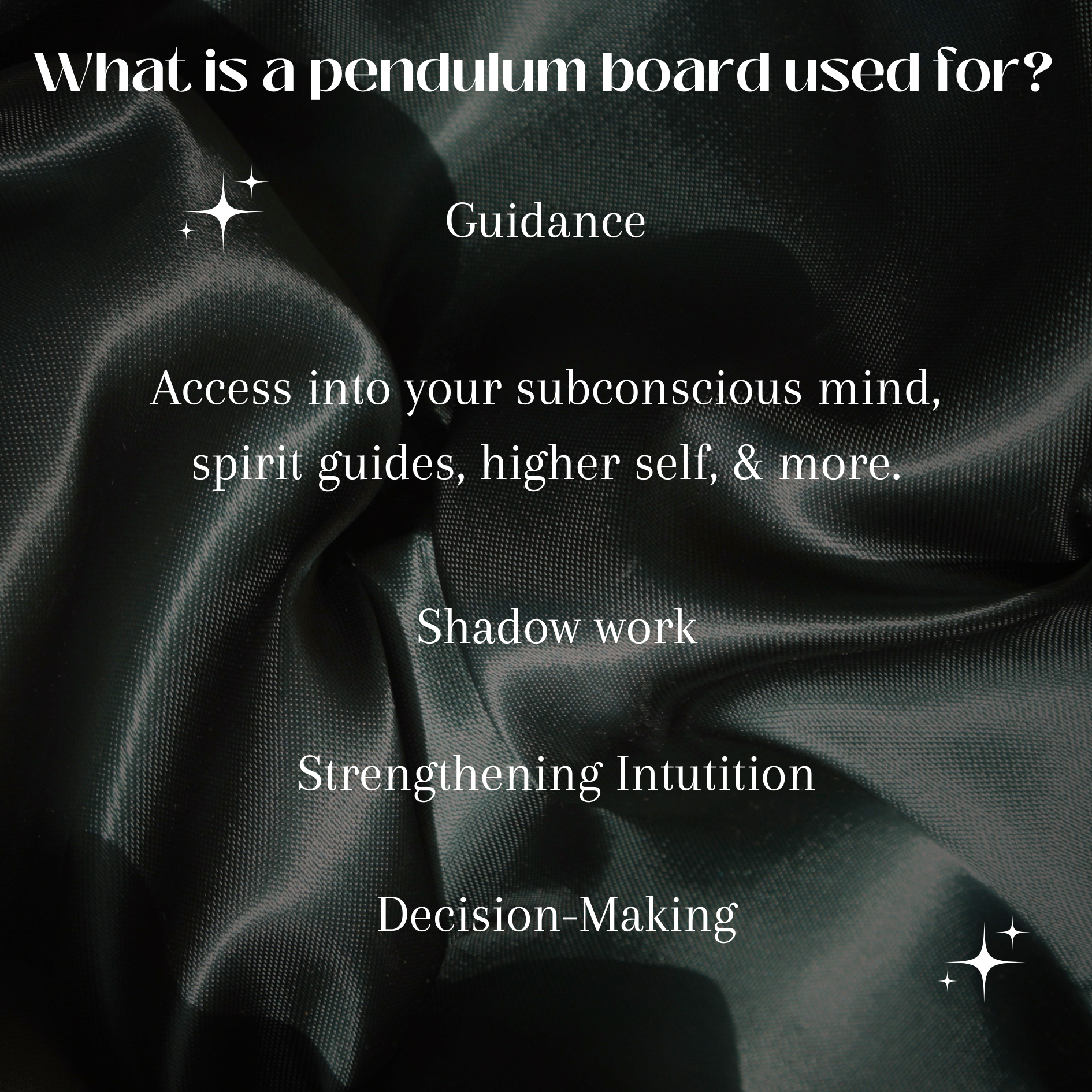 A pendulum board is a divination tool used to assist in one's decision making process. It is used alongside a pendulum to ask "yes" or "no" questions. Use this board to connect to your higher self, spirit guides, or sub-conscious. Always remember to cleanse and specify your source for answers before using a pendulum board.